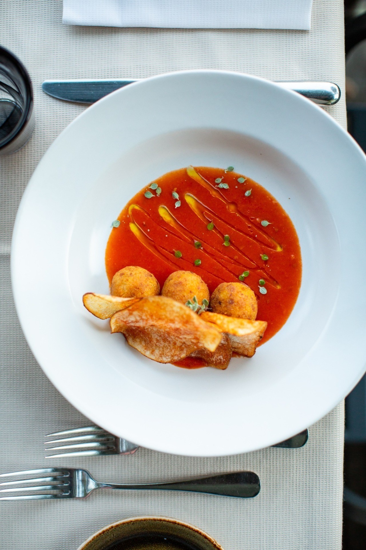 Branzino croquettes served over creamy puréed tomato sauce and Terre Alte di Pietramala potato chips. Serves 2